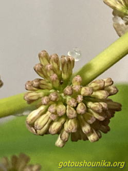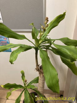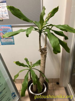 風除室にある木ですが、開業10年の時にもらった木で水と少しの肥料をあげていて葉っぱは時々剪定していたようです。先週から花芽がついたと事務員さんが教えてくれました。ドラセナという木のようで、幸福の木と言われるようです。10年に1回花を咲かせるとネットにありました。それも夜に咲くと。